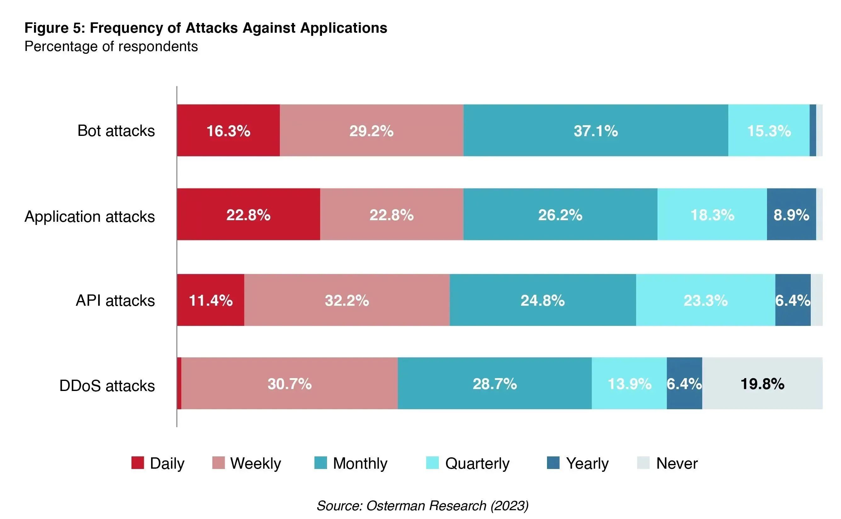 报告显示,在过去12个月中,针对应用程序的机器人、应用程序 、API和DDoS攻击的频率激增。在过去的一年中,应用攻击已成为每天最频繁发生的攻击,从2022年的4%跃升至2023年的23%。