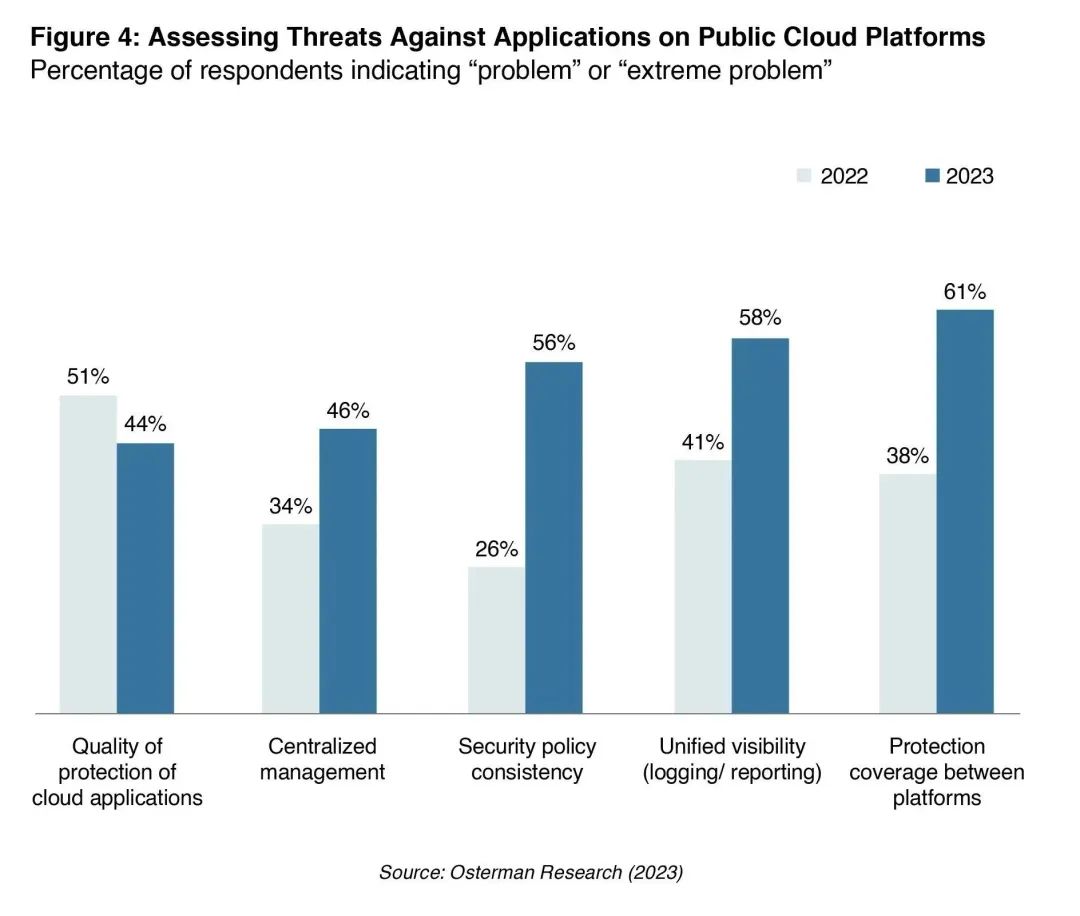 调查显示,在2022年至2023年间,对公有云安全的关注显著增加。无法实现一致的安全策略是去年增长最快的问题。2023年,超过一半的受访者(56%)将无法实现一致的安全策略视为难题(多数认为难度极高),高于2022年的26%。被受访者视为难题或极端问题的其他领域包括: