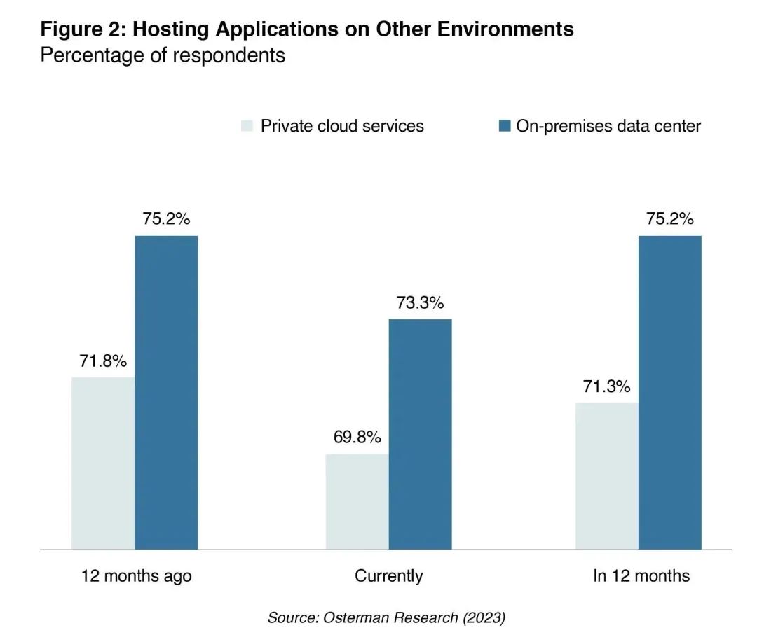 虽然每个企业都至少依赖一个公有云平台,但大约70%的企业表示也会使用私有云服务和本地数据中心来托管应用程序。